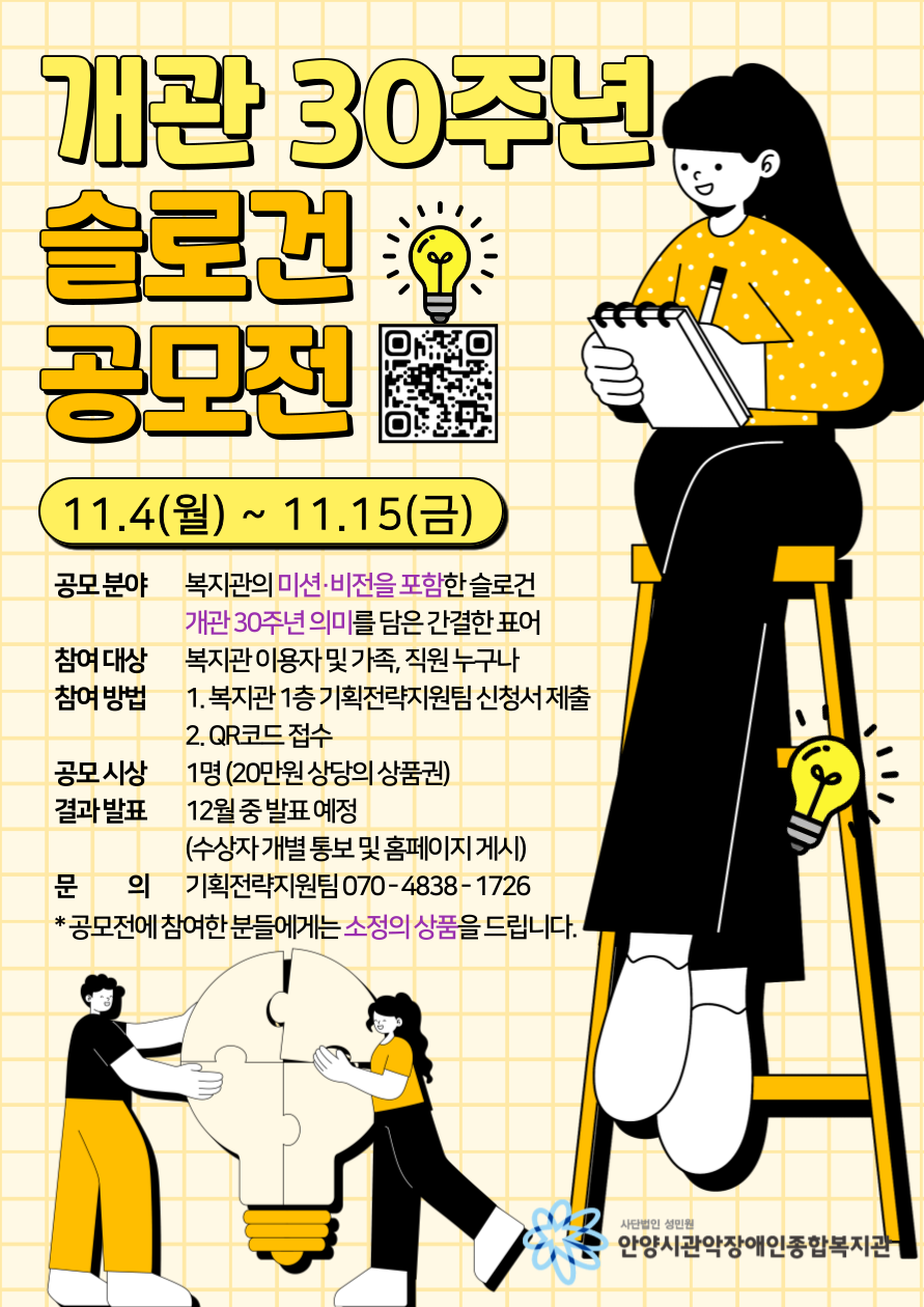 우리 복지관의 개관 30주년을 맞이하여 슬로건 공모전을 진행합니다.