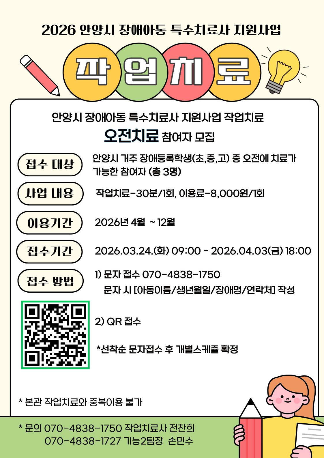 안양시관악장애인복지관에서 2026년 안양시 장애아동 특수치료사 지원사업 작업치료 오전치료 참여자 모집을 하고자 합니다.