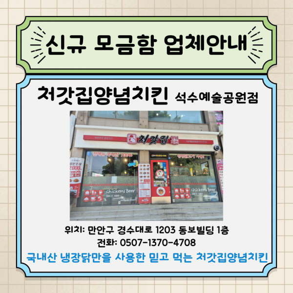 목록 처갓집양념치킨 석수예술공원점 페이지 정보 이재인 조회 442 입력 2024-06-28 17:02 댓글 0 본문 위 업체는 안양시관악장애인종합복지관에 후원해주시는 '든든한 이웃'입니다.많은 관심과 이용부탁드립니다.주소: 경기도 안양시 만안구 경수대로 1203 동보빌딩 1층연락처: 0507-1370-4708처갓집양념치킨 석수예술공원점 목록 이전글세븐일레븐 석수센터점 2024.08.09 다음글훌랄라참숯치킨 안양예술공원점 2024.06.20 댓글 0 댓글목록 등록된 댓글이 없습니다.
