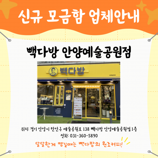 목록 빽다방 안양예술공원점 페이지 정보 이재인 조회 641 입력 2023-03-17 11:03 댓글 0 본문 위 업체는 안양시관악장애인종합복지관에 후원해주시는 '든든한 이웃'입니다.많은 관심과 이용부탁드립니다.주소: 경기도 안양시 만안구 예술공원로 138 빽다방 안양예술공원점 1층연락처: 031-360-5890빽다방 안양예술공원점테이크아웃커피 관련링크 https://map.naver.com/v5/entry/place/1878105510?lng=126.92145391913128… 578회 연결 목록 이전글냉면장인 임사부&국밥 2023.03.17 다음글예술풍천민물장어 2023.03.17 댓글 0 댓글목록 등록된 댓글이 없습니다.