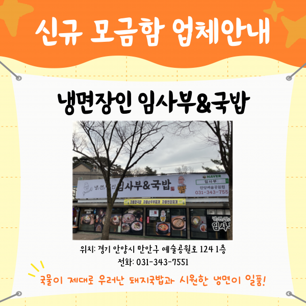 목록 냉면장인 임사부&국밥 페이지 정보 이재인 조회 586 입력 2023-03-17 11:06 댓글 0 본문 위 업체는 안양시관악장애인종합복지관에 후원해주시는 '든든한 이웃'입니다.많은 관심과 이용부탁드립니다.주소: 경기도 안양시 만안구 예술공원로 124 1층연락처: 031-343-7551냉면장인 임사부&국밥한식 관련링크 https://map.naver.com/v5/entry/place/1226422028?lng=126.9197099&lat=37… 794회 연결 목록 이전글콩서리순두부 2023.03.17 다음글빽다방 안양예술공원점 2023.03.17 댓글 0 댓글목록 등록된 댓글이 없습니다.