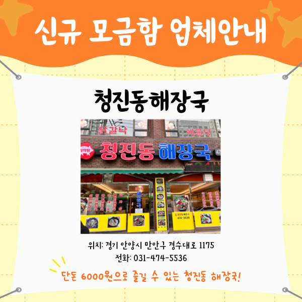 목록 청진동해장국 페이지 정보 이재인 조회 569 입력 2023-03-17 11:10 댓글 0 본문 위 업체는 안양시관악장애인종합복지관에 후원해주시는 '든든한 이웃'입니다.많은 관심과 이용부탁드립니다.주소: 경기도 안양시 만안구 경수대로 1175연락처: 031-474-5536청진동해장국 본점해장국 관련링크 https://map.naver.com/v5/search/%EC%B2%AD%EC%A7%84%EB%8F%99%ED%95%B4%E… 500회 연결 목록 이전글25시 멸치국수 장터국밥 2023.03.17 다음글콩서리순두부 2023.03.17 댓글 0 댓글목록 등록된 댓글이 없습니다.