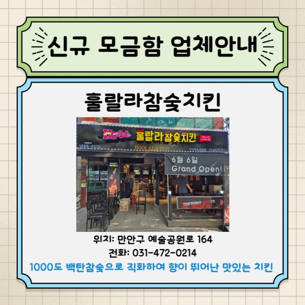 목록 훌랄라참숯치킨 안양예술공원점 페이지 정보 이재인 조회 471 입력 2024-06-20 14:15 댓글 0 본문 위 업체는 안양시관악장애인종합복지관에 후원해주시는 '든든한 이웃'입니다.많은 관심과 이용부탁드립니다.주소: 경기도 안양시 만안구 예술공원로 164연락처: 031-472-0214훌랄라참숯치킨 안양예술공원점 목록 이전글처갓집양념치킨 석수예술공원점 2024.06.28 다음글본도시락 안양호계점 2024.06.20 댓글 0 댓글목록 등록된 댓글이 없습니다.