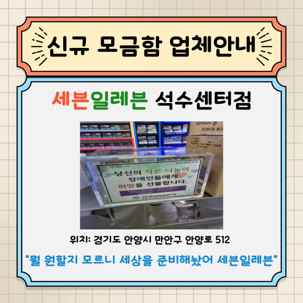 목록 세븐일레븐 석수센터점 페이지 정보 이재인 조회 373 입력 2024-08-09 16:56 댓글 0 본문 위 업체는 안양시관악장애인종합복지관에 후원해주시는 '든든한 이웃'입니다.많은 관심과 이용부탁드립니다.주소: 경기도 안양시 만안구 안양로 512세븐일레븐 석수센터점 목록 이전글세븐일레븐 안양석수대림점 2024.08.09 다음글처갓집양념치킨 석수예술공원점 2024.06.28 댓글 0 댓글목록 등록된 댓글이 없습니다.
