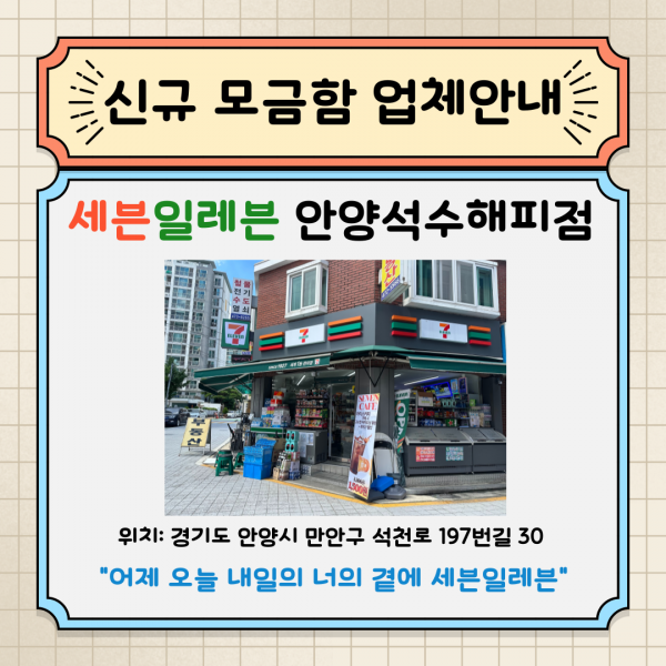 목록 세븐일레븐 안양석수해피점 페이지 정보 이재인 조회 373 입력 2024-08-09 16:59 댓글 0 본문 위 업체는 안양시관악장애인종합복지관에 후원해주시는 '든든한 이웃'입니다.많은 관심과 이용부탁드립니다.주소: 경기도 안양시 만안구 석천로197번길 30세븐일레븐 안양석수해피점 목록 이전글GS25 안양무림점 2024.08.09 다음글세븐일레븐 안양석수대림점 2024.08.09 댓글 0 댓글목록 등록된 댓글이 없습니다.