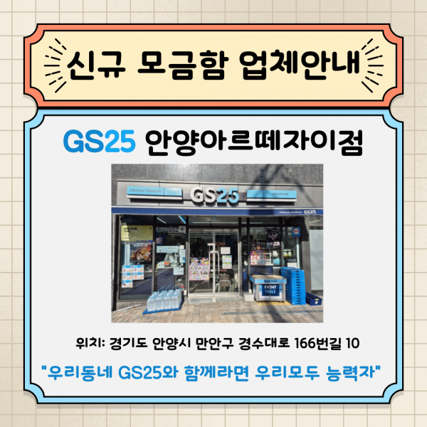 목록 GS25 안양아르떼자이점 페이지 정보 이재인 조회 149 입력 2024-12-03 10:12 댓글 0 본문 위 업체는 안양시관악장애인종합복지관에 후원해주시는 '든든한 이웃'입니다.많은 관심과 이용부탁드립니다.주소: 경기도 안양시 만안구 경수대로 166번길 10GS25 안양아르테자이점 목록 이전글2024년 모금함비치업체 2025.01.02 다음글GS25 안양무림점 2024.08.09 댓글 0 댓글목록 등록된 댓글이 없습니다.