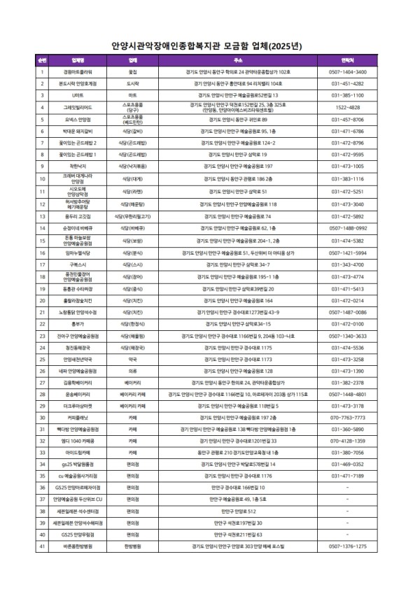 목록 2025년 모금함 비치업체 페이지 정보 이재인 조회 27 입력 2025-12-30 10:43 댓글 0 본문 위 업체는 안양시관악장애인종합복지관에 후원해주시는 '든든한 이웃'입니다.많은 관심과 이용부탁드립니다. 목록 다음글임마누엘식당 본점 2025.07.23 댓글 0 댓글목록 등록된 댓글이 없습니다.
