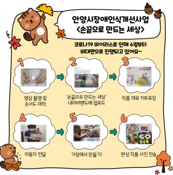 코로나-19 바이러스로 인해 2020년 6월부터 안양시장애인식개선사업 '손끝으로 만드는 세상' 비대면으로 사업진행하고 있습니다. 영상을 촬영하고 순서도를 만들어 ‘손끝으로 만드는 세상’ 네이버밴드에 업로드하고 있으며, 키트를 배부하여 재가장애인들 각자 가정에서 작품을 만들고 있습니다.