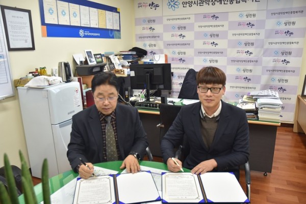 안양시관악장애인종합복지관 1층 관장실에서 상호 협동 체제와 자원봉사활동의 활성화를 위해 안양시자원봉사센터(소장 박양숙)와 안양관악장애인종합복지관(관장 박용구)이 업무협약을 하였습니댜.