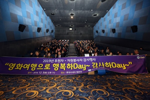 안양시관악장애인종합복지관(관장 박용구)은 지난 3일 오후 7시 롯데시네마 평촌점에서 2019년 후원·자원봉사자 감사행사 ‘영화여행으로 행복하day~감사하day~’를 성황리에 개최하였다. 감사행사는 한 해 동안 복지관에 후원과 자원봉사로 장애인복지사업에 지속적인 관심을 주신 후원자, 자원봉사자들에게 감사의 마음을 전하고 노고를 격려하고자 진행된 행사이다. 행사에는 안양시의회 김선화 의장을 비롯한 내빈, 안양시관악장애인종합복지관 직원, 후원자, 자원봉사자 등 100여 명이 참석하여 자리를 빛내주었다.