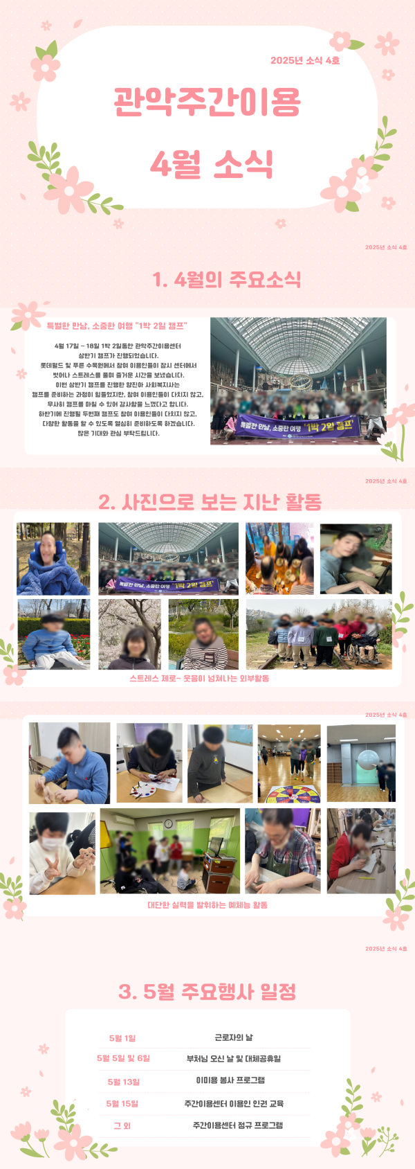 목록 2025년 주간이용센터 4월 소식 페이지 정보 정지영 조회 185 입력 2025-04-30 17:06 댓글 0 본문 만개한 벚꽃으로 인해 따뜻하고, 행복했던 4월의 관악주간이용센터 활동 소식을 공유하고자 합니다. 목록 이전글기능강화지원2팀 치료컨설팅 진행 2025.04.30 다음글2025년 안양시장애인인식개선사업 링크-업 4월 동아리 활동 2025.04.30 댓글 0 댓글목록 등록된 댓글이 없습니다.