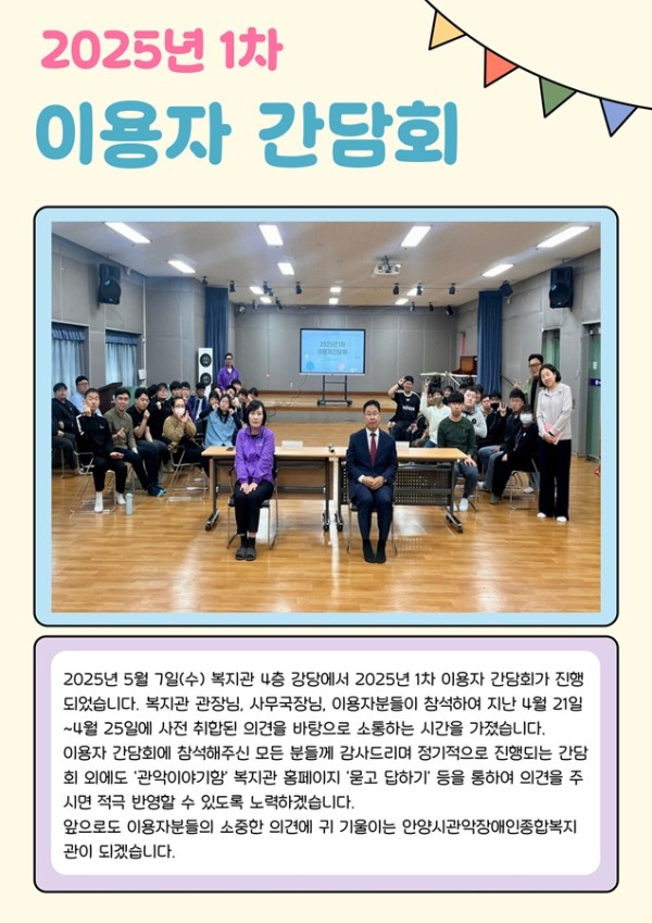 목록 2025년 1차 이용자 간담회 페이지 정보 서재현 조회 195 입력 2025-05-08 09:39 댓글 0 본문 . 목록 이전글작업활동2반 5차 자립생활기술훈련 2025.05.09 다음글직업적응훈련반 제5차 일상생활훈련(어버이날 기념 수제 디저트 만들기) 2025.05.07 댓글 0 댓글목록 등록된 댓글이 없습니다.