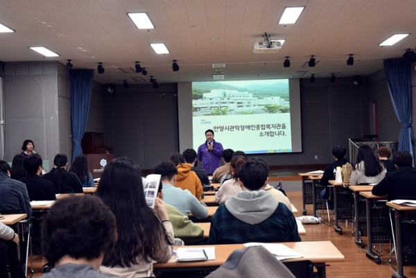 이번 기관방문은 지역사회복지론 수업의 일환으로 담당교수인 최성숙 교수님의 인솔하에 학생들이 방문하였고, 지역 내 장애인복지관의 현황과 사업들에 대해 살펴보는 시간으로 계획하여 안양시 인구현황부터 기관의 전반적인 현황(운영목적, 미션·비전·실천전략, 연혁, 조직도), 9개의 팀별 사업을 소개하는 것으로 기관소개를 마쳤습니다.