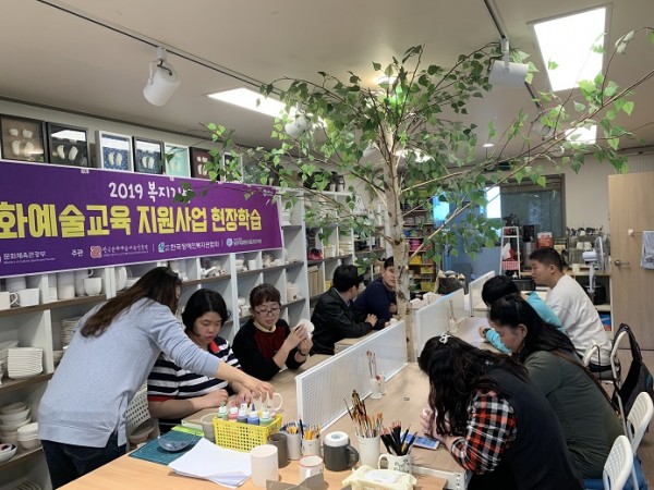 지난 금요일 2019 복지기관 문화예술교육 지원사업 미술활동 참여자들을 대상으로 현장학습을 진행하였습니다. 관내에서는 경험할 수 없었던 도자기 공예를 체험하였습니다. 컵에 예쁜 그림을 그리고 색칠하여 나만의 머그컵을 완성하며 즐거운 시간을 보냈습니다.