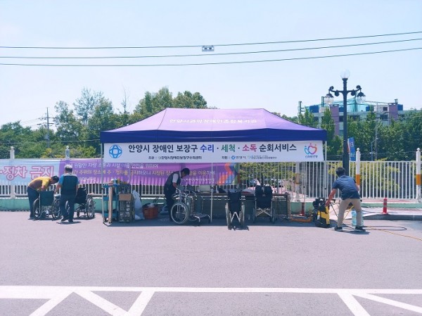 6월25일 화요일 13시부터 16시 30분까지 우리 복지관 현관앞에서 안양시보장구수리센터(소장 이용훈)의 안양시 장애인보장구 수리.세척. 소독 순회서비스로 휠체어의 세척, 점검, 수리 등 보장구 수리와 관련된 전문적인 서비스를 제공하였습니다.