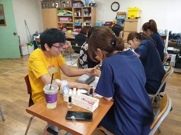 2019. 6. 27(목) 10시부터 12시까지 평촌아크로타워 “네일 숲”의 김진영 원장님과 직원분들이 우리기관의 이용자분들을 대상으로 올해 3번째 네일아트를 해주었습니다.