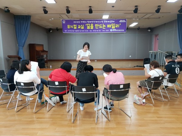 2019년 안양시장애인 인식개선사업 문화예술분야 꿈을 만드는 패밀리(뮤지컬 교실) 프로그램이 6월 3일부터12월까지 총 25회기를 목표로 참가자 10명의 아동, 청소년, 성인들로 구성되어 진행되고 있습니다.