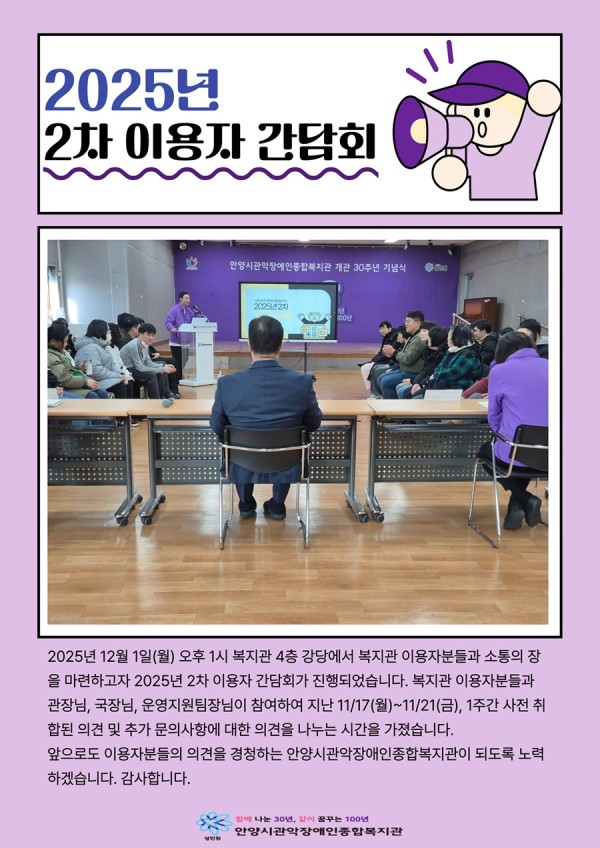 목록 2025년 2차 이용자간담회 페이지 정보 서재현 조회 31 입력 2025-12-02 11:29 댓글 0 본문 목록 이전글2025년 취업자 부모간담회 2025.12.02 다음글우수활동지원사 해외연수 2025.12.01 댓글 0 댓글목록 등록된 댓글이 없습니다.
