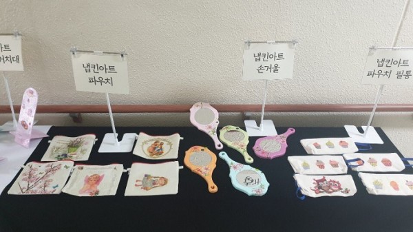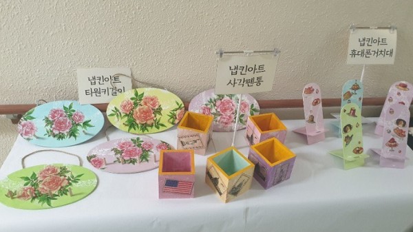 복지관 이용자들이 열심히 제작한 주간보호센터 냅킨아트 작품과 공동생활가정, 아동발달센터, 평생교육지원팀 이용자분들이 열심히 만든 작품을 기관 로비 및 복도에서 전시하였습니다~