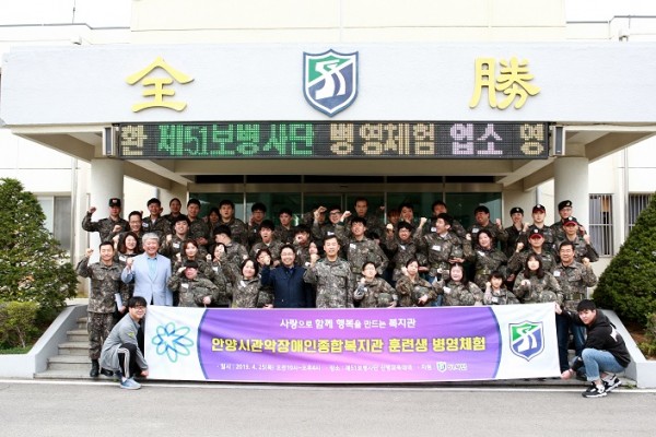 지난 4월 25일(목) 직업지원팀 훈련생들과 본 복지관 관장, 국장이 함께 훈련생 연수회(병영체험)을 진행하였습니다. 복지관과 협약하여 정기 자원봉사를 오시는 51사단의 박주현 원사님의 도움으로 제51보병사단 신병교육대대에서 병영체험을 진행할 수 있었습니다. 부대에 도착하여 입소식을 진행하였으며, 부대소개 영상을 시청하였습니다. 부대 내에서 점심식사를 마친 후 페인트총을 이용하여 사격체험을 하고 병영시설과 물자, 장비를 견학하였으며, 퇴소식으로 마무리하였습니다. 51사단 사단장님께서 훈련생 한명한명과 인사를 하고 사진을 찍어주었으며, 기념품으로 머그컵을 제작하여 훈련생들에게 선물해주었습니다. 훈련생들은 군부대 시설과 장비 등을 견학하며 색다른 경험이었다고 말하며 즐겁게 체험하였습니다. 훈련생 연수회를 원활하게 진행할 수 있도록 도와주신 관장님, 국장님과 제 51사단 박주현 원사님께 다시 한 번 감사의 말씀을 드립니다.