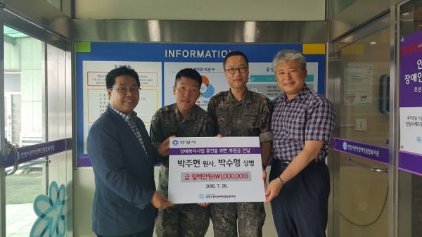전달해주신 소중한 후원금은 장애복지사업의 증진을 위해 쓰여 질 예정이며, 후원해주신 박주현 원사, 박수형 상병께 감사의 말씀을 드립니다.