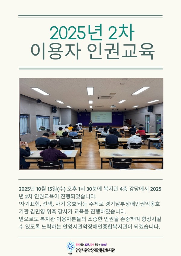목록 2025년 2차 이용자 인권교육 페이지 정보 서재현 조회 102 입력 2025-10-22 10:08 댓글 0 본문 목록 이전글세심(洗心) 3차년도 마음건강강좌 2025.10.22 다음글2025년 4차 장애인식개선캠페인 2025.10.20 댓글 0 댓글목록 등록된 댓글이 없습니다.