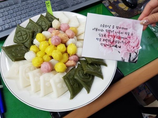 복지관을 대표하여 관장님께 꽃을 전달해 주시고 떡을 준비해주셔서 직원들과 이용자들이 함께 나누어 먹었습니다.