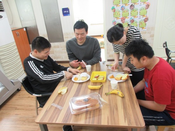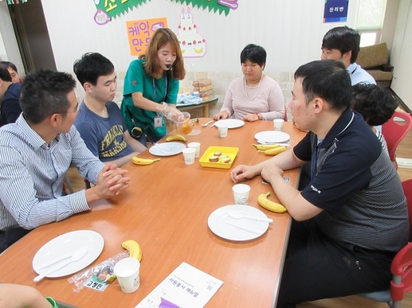 이용자들을 위해 소그룹활동으로 케익만들기를 진행하였습니다. 재료들을 가지고 게임을 한 뒤 정답을 맞춘 이용자들에게 풍성한 재료들을 나누워주며 기쁨이 더욱더 커졌습니다. 자신이 만든 케익을 가지고 생일자에게 전달하며[생일축하합니다]노래를 부르고 행복한 시간을 가졌습니다.