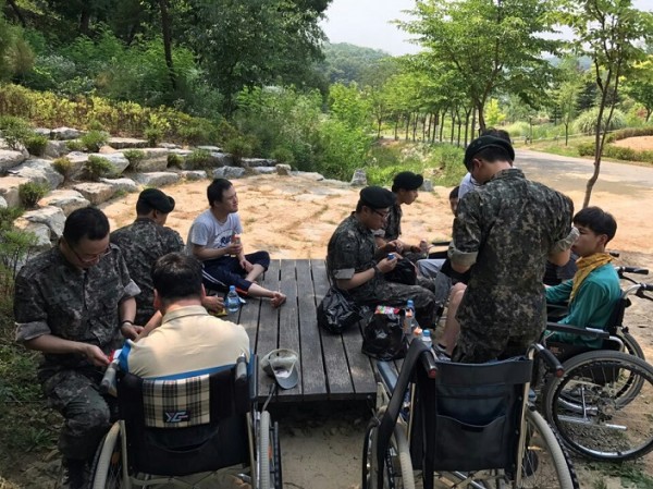 주간보호센터 사랑반, 소망반 친구들이 부천자연생태공원으로 51사단 군인자원봉사자분들과 함께 현장학습을 다녀왔습니다. 무릉도원 수목원 입구에서 시원한 폭포도 보았으며, 나무들 사이로 산책을 하였으며 농경유물전시관에 들러 옛날 농기구들을 살펴보았습니다. 그 후 그늘진 마루에 앉아 이용자와 함께 간식을 나누어먹고 이야기를 나누며 휴식하며 즐거운 시간을 보냈습니다.