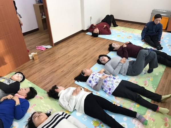스스로 깨끗이 씻지 못하는 이용자들을 선생님의 도움으로 세수한 뒤, 프로그램실에 옹기종기 모여 누웠습니다.