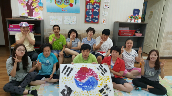 이용자들과 함께 광복절의 의미와 태극기 문양의 뜻에 관하여 이야기를 나누고