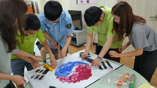 A3크기의 도화지에 태극문양을 그려넣어 스폰지에 빨강,파랑,노랑,검정