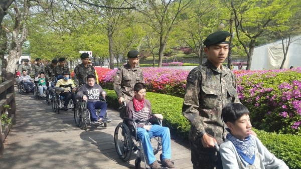 군인자원봉사자와 1:1로 매칭하여 산책을 하며 활짝 핀 꽃들의 향기를 맡아보았고, 새롭게 변화한 주변시설을 관찰하며 여유롭고 즐거운 야외활동이 되었습니다.