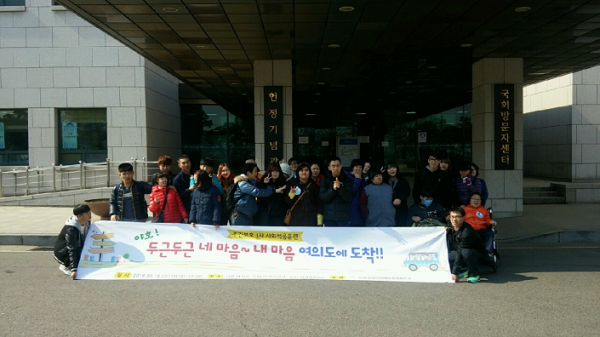 헌정기념관앞에 도착하여 이용자분들과 자원봉사자분들이 함께 모여 단체사진을 촬영한 뒤에 즐거운 견학이 시작되었습니다.