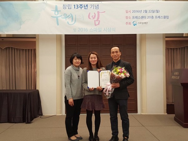 2월 22일 한국프레스센터 20층 프레스클럽 스마일재단 '창립13주년 기념 후원의 밤 및 2016년 스마일시상식' 에 아름다운치과 봉사회 대표 서정수원장, 지역연계팀 장선혜팀장, 채화엽담당자가 참석하여 수상의 기쁨을 함께 나누었습니다.