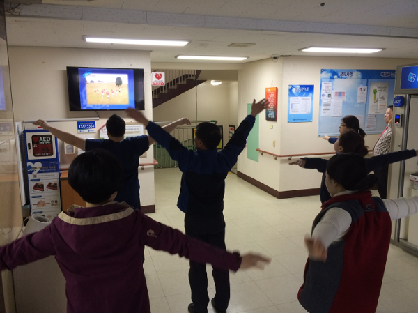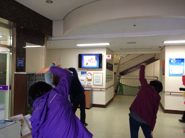 해야할 업무나 사정이 있으신 분들은 음악에 맞춰 제자리에서 체조를 함께하곤 합니다.