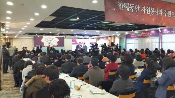 안양시관악장애인복지관은 11월27일(목) 10시 30분부터 한 해 동안 복지관을 위해 관심과 사랑을 주신 후원자와 자원봉사자에 대한 감사의 마음을 전하고자 성민원 및 산하기관과 함께 "제15회 빛사랑모임"을 산본 애스톤하우스에서 진행하였습니다. 행사 주요내용으로는 법인행사, 축하공연이 진행되었고 기념식 및 시상식을 통해 한 해 동안 도움을 주신 우수후원자와 자원봉사, 직원에 대한 시상을 통해 감사의 마음을 전하는 시간을 가졌습니다. 이날 이종걸 국회의원을 대신해 김종찬 사무국장과 , 김민수 경기도장애인복지관협회장, 유경호 경기도사회복지사협회 부회장, 이정구 안양시사회복지사협회장, 류상열 안양시사회복지협의회장이 참석하여 자리를 빛내주셨습니다.