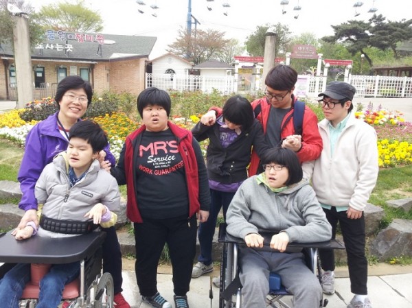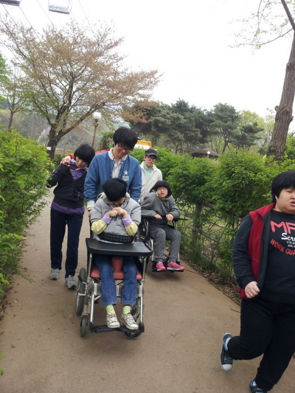 공익요원의 도움으로 휠체어를 타고 여유있게 주변을 살피면서 좋아하는 친구들,,,