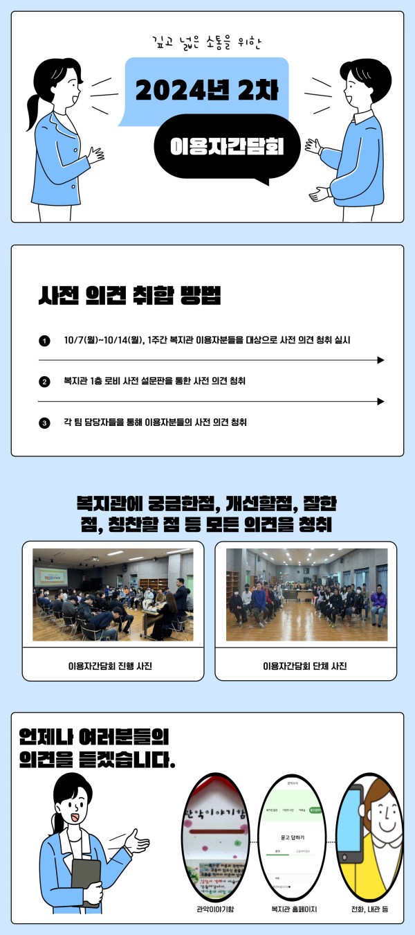 이용자 간담회에 참석해주신 모든 분들게 감사드리며 정기적으로 진행되는 간담회 외에도 복지관 내 ‘관악이야기함’ 또는 전화(070-4838-1704)을 통하여 의견 주시면 적극 반영할 수 있도록 노력하겠습니다.