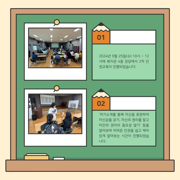 2024년 9월 25일(수) 오전 10시에 복지관 4층 강당에서 2차 이용자 인권교육이 진행되었습니다.