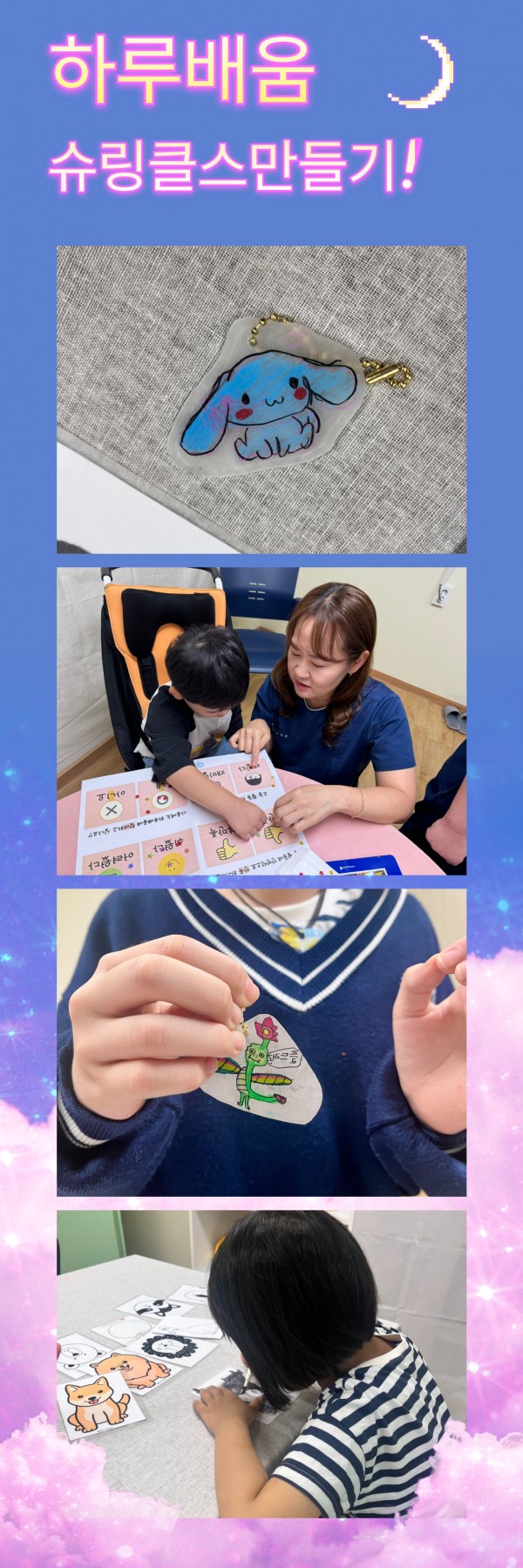 캐릭터를 참여자가 선택하여 그림을 그리고 색칠하여 슈링클스 열쇠고리를 만들었습니다.