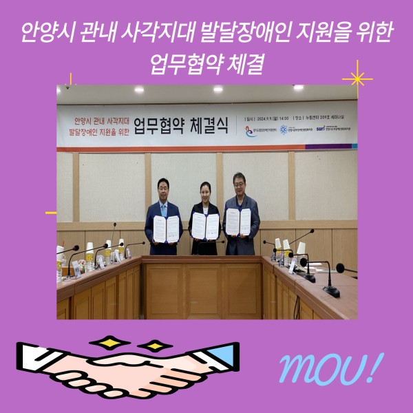 9월 9일(월)안양시관악장애인종합복지관(관장 박용구)과 안양시수리장애인종합복지관(관장 이형진), 한국장애인개발원 경기도발달장애인지원센터(센터장 김민영)는 안양시 관내 사각지대 발달장애인 지원을 위한 업무협약을 체결했습니다.