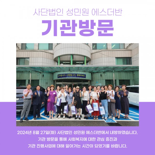 목록 사단법인 성민원 에스더반 기관방문 진행 페이지 정보 김지혜 조회 761 입력 2024-08-28 10:12 댓글 0 본문 2024년 8월 27일(화) 사단법인 성민원 에스더반에서 내방하였습니다,기관 방문을 통해 사회복지에 대한 관심 증진과 기관 진행사업에 대해 알아가는 시간이 되었기를 바랍니다. 목록 이전글지역조사단(자원봉사자) 교육 2024.09.02 다음글2024년 하계 사회복지/직업재활 현장실습 종결평가회 진행 2024.08.28 댓글 0 댓글목록 등록된 댓글이 없습니다.