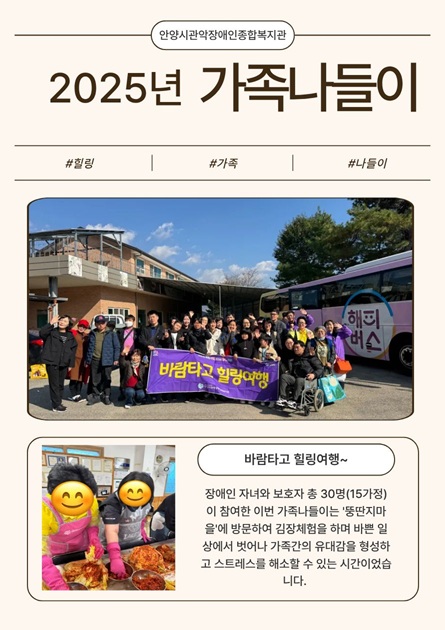 앞으로도 장애인 가족의 삶에 활력을 더 할 수 있는 다양한 프로그램을 준비하는 안양시관악장애인종합복지관이 되겠습니다. 감사합니다.