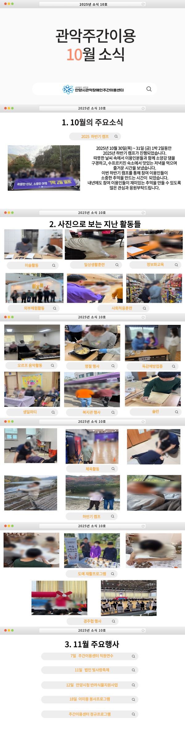 목록 2025년 안양시관악장애인주간이용센터 10월 소식 페이지 정보 정지영 조회 97 입력 2025-11-10 13:07 댓글 0 본문 가을이 깊어가는 10월, 주간이용센터에서는 하반기 캠프를 비롯해 미술활동, 일상생활훈련 등 다양한 프로그램이 진행되었습니다.이용인분들의 적극적인 참여와 웃음으로 한 달 내내 활기찬 시간이 이어졌습니다.앞으로도 풍성하고, 즐거운 활동으로 찾아뵙겠습니다.많은 관심과 기대부탁드립니다. 목록 이전글[세심사] 내 마음이 보내는 '방전' 신호 2025.11.12 다음글2025년 11월 후원소식 +3 2025.11.07 댓글 0 댓글목록 등록된 댓글이 없습니다.