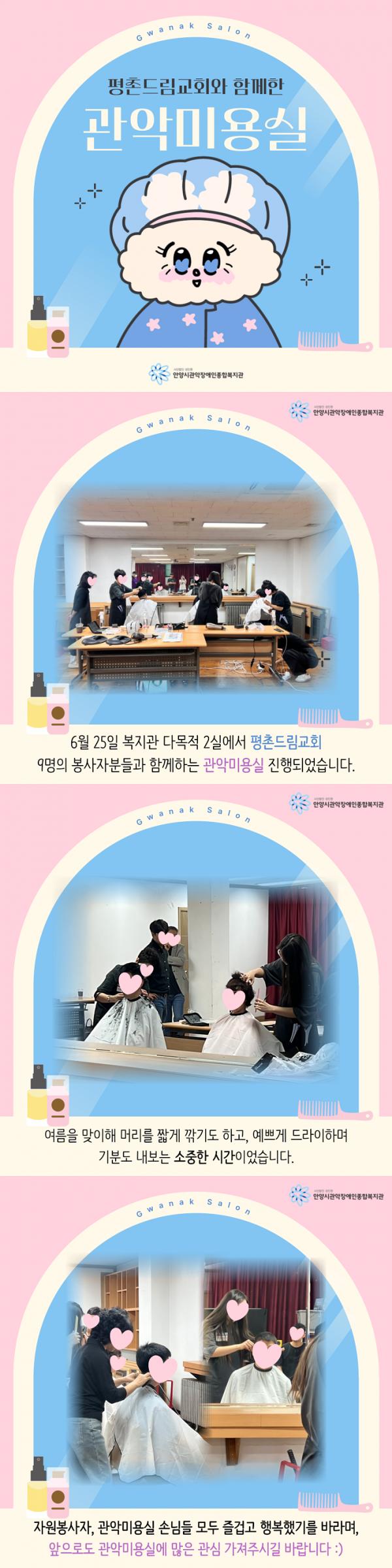 자원봉사자, 관악미용실 손님들 모두 즐겁고 행복했기를 바라며, 앞으로도 관악미용실에 많은 관심 가져주시길 바랍니다 :)