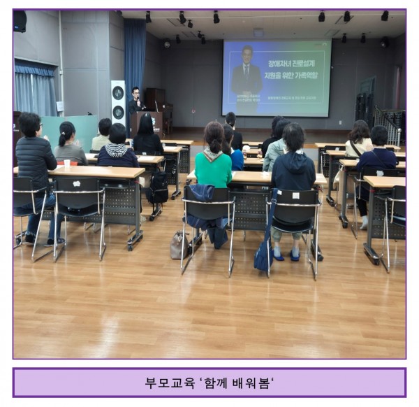 2024년 4월 16일(화) 오전 10시에 복지관 4층 강당에서 제 44회 장애인의 날을 기념하여 2024 장애공감행사 ‘함께하여 좋은 날’ - 부모교육 ‘함께 배워봄’이 진행되었습니다.