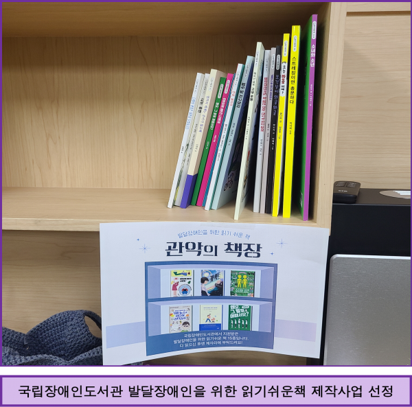 안양시관악장애인복지관은 국립장애인도서관의 "2023 발달장애인을 위한 읽기 쉬운 책 제작사업"에 선정되어 책 15종을 지원받았습니다. 복지관을 이용하시는 이용자와 보호자가 이용하실 수 있도록 2층 부모대기실에 책을 비치하였습니다. 많은 이용바랍니다.