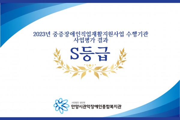 올해 진행된 "2023년 중증장애인직업재활지원사업 수행기관(유형: 직업재활센터) 사업평가"에서 우리 안양시관악장애인복지관이 S등급에 선정되었습니다.