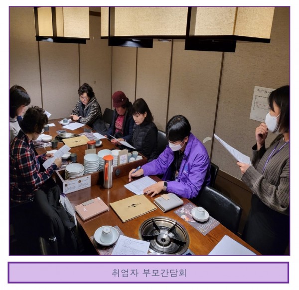올해도 연말에 취업자의 보호자분들과 취업자들의 근황, 고충, 보호자분들의 고민에 대해 서로 이야기를 나눌 수 있는 간담회 자리를 마련했습니다. 우선 1년간 취업자들과 어떠한 프로그램들을 진행했는지 전달하였고 내년에도 있을 취업자 프로그램을 홍보하였습니다. 또한 다양한 고용환경에서 근무하는 취업자 자녀들의 이야기를 보호자 간에 서로 활발하게 나누면서 좀 더 새로운 정보에 접할 수 있는 기회도 가질 수 있었습니다.